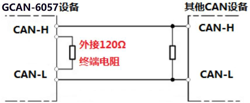 請(qǐng)注意:GCAN-6057模塊內(nèi)部未集成120Ω終端電阻。如果節(jié)點(diǎn)數(shù)目大于2,中間節(jié)點(diǎn)不需要安裝120Ω的終端電阻。需要使用時(shí),將電阻兩端分別接入CAN_H、CAN_L即可,如圖3.2所示。