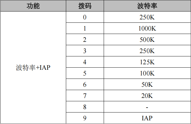 波特率與開(kāi)關(guān)設(shè)置對(duì)應(yīng)值如下表4.1所示。GCAN-6057模塊撥碼開(kāi)關(guān)“0”到“7”為波特率設(shè)置開(kāi)關(guān);“9”為復(fù)位按鍵,為調(diào)試接口,請(qǐng)不要撥動(dòng)。