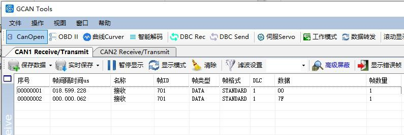 例如:通過(guò)撥碼開(kāi)關(guān)設(shè)置GCAN-6057的Node ID為1(以下節(jié)點(diǎn)號(hào)均為1),則USBCAN-II Pro作為主站設(shè)備可接收到一條節(jié)點(diǎn)狀態(tài)數(shù)據(jù),幀ID為0x701,幀數(shù)據(jù)為0x7F。如圖5.1所示,使用GCANTools軟件可以收到這條數(shù)據(jù)。