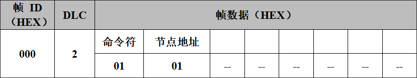 GCAN-6057模塊接收由主站發(fā)出的操作指令,幀ID為0x000,DLC為2,幀數(shù)據(jù)第一個(gè)字節(jié)為命令符,第二個(gè)字節(jié)為節(jié)點(diǎn)號(hào)(00則為全部節(jié)點(diǎn))。