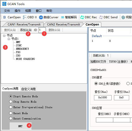例如:GCAN-6057的Node ID為1,命令GCAN-6057為進(jìn)入操作狀態(tài)(01),則NMT命令幀ID為0x000,幀數(shù)據(jù)為0x01,0x01。該命令也可由GCANTools軟件的CANopenMaster插件發(fā)出。NMT的詳細(xì)指令可參考附錄B.4 CANopen通信。
