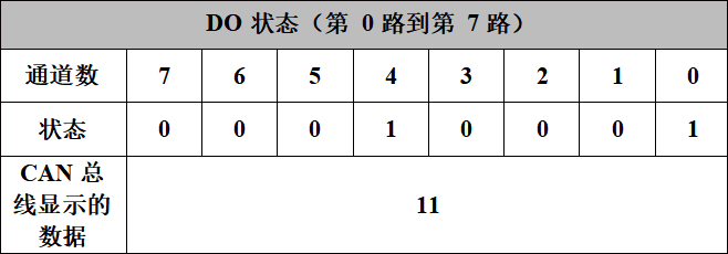 GCAN-6057模塊在接收RPDO數(shù)據(jù)時(shí),需保證幀ID為0x200+節(jié)點(diǎn)號(hào)(Node ID),數(shù)據(jù)長(zhǎng)度為1字節(jié),該字節(jié)用于設(shè)置第0到7輸出通道的狀態(tài),其中輸出通道7處于高位,輸出通道0處于低位。