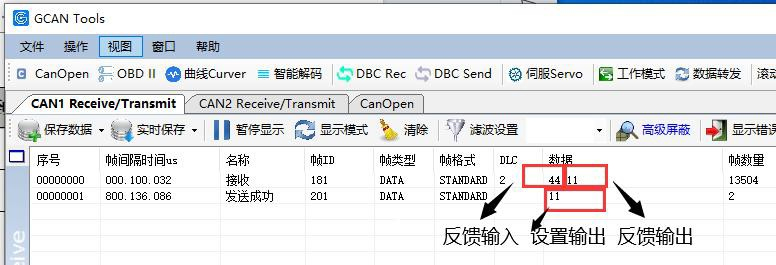例如,GCAN-6057模塊節(jié)點(diǎn)號(hào)設(shè)為1。需設(shè)置通道4和通道0狀態(tài)為1,設(shè)置其他狀態(tài)均為0,則需要發(fā)送的CAN總線DO狀態(tài)數(shù)據(jù)為11。需要發(fā)送給GCAN-6057的幀ID為0x201,數(shù)據(jù)長(zhǎng)度(DLC)為1,幀數(shù)據(jù)為0x11。