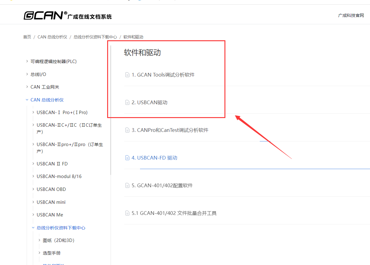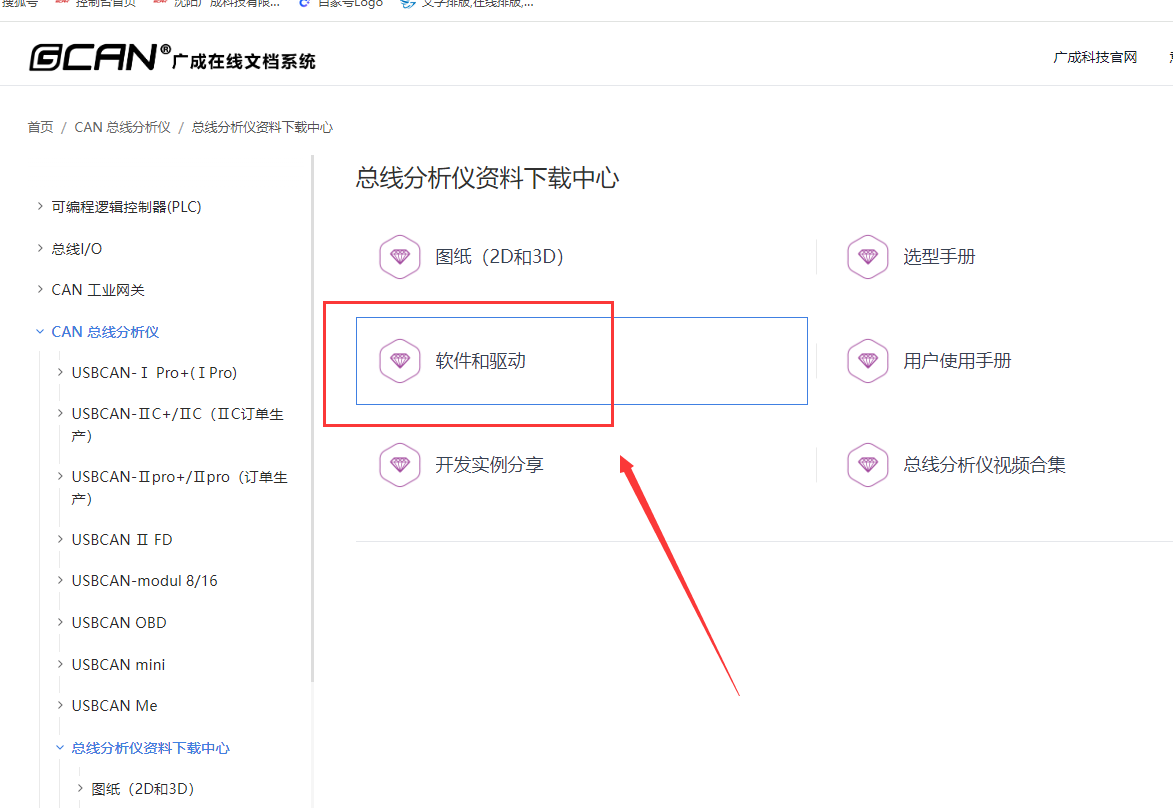 點擊進入之后,找到“軟件和驅(qū)動”選項,在里面盡可以下載各種CAN盒上位機軟件和驅(qū)動了,我們的驅(qū)動和軟件對廣成CAN分析儀都是通用的,可以放心下載使用。