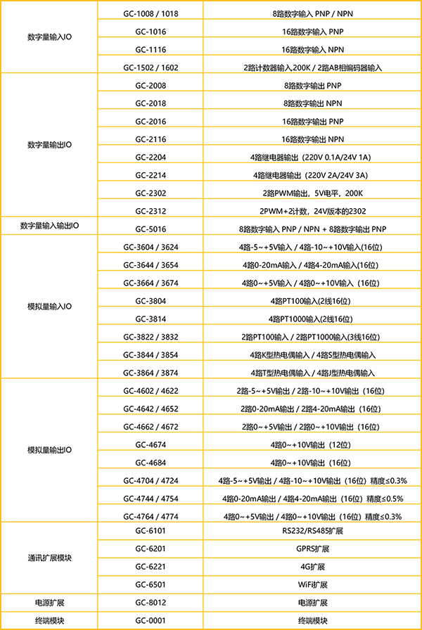 (2)支持IO接口擴(kuò)展,擴(kuò)展IO類(lèi)型包括各種數(shù)字量模擬量輸入輸出IO(下圖表格部分展示)。最高可擴(kuò)展數(shù)量達(dá)到512個(gè)。