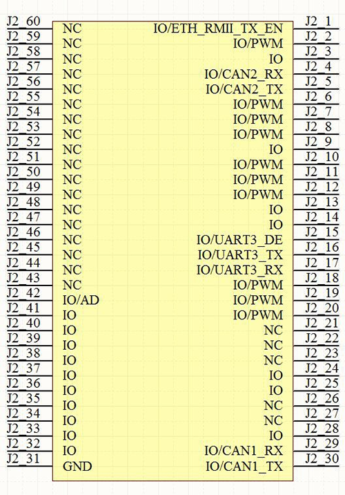 GCAN-PLCcore-M7核心板采用“3710F端子”型號(hào)連接器與底板連接,如用戶想自己開發(fā)底板,則底板參考原理圖及引腳定義如下圖所示,具體連接器原理圖及封裝可收到貨后向技術(shù)支持工程師索要。
