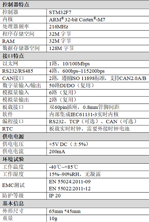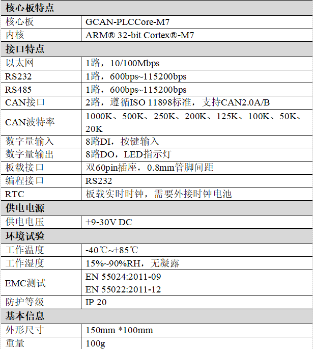 PLCCore-EDV-M7開發(fā)套件(GCAN-PLCCore-M7核心板配套底板)技術(shù)參數(shù)如下所示: