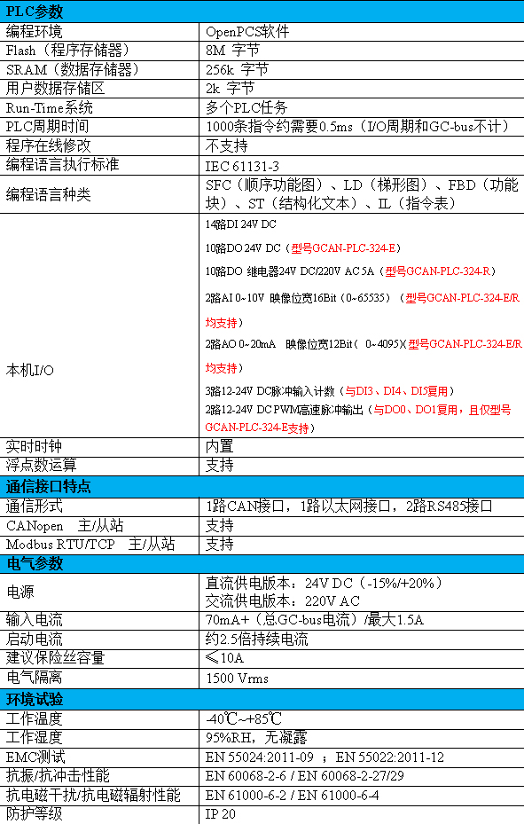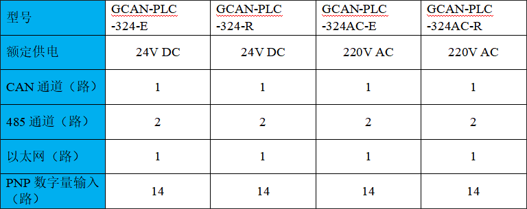 GCAN-PLC-324-E/R系列為滿足多種使用場景,設(shè)計(jì)為2種供電方式,直流供電型號:GCAN-PLC-324-E/R,交流供電型號GCAN-PLC-324AC-E/R。二、型號對照及性能特點(diǎn)