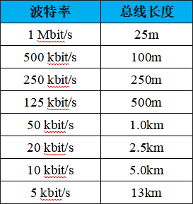 波特率與最大總線長度參照表