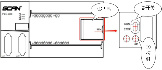 GCAN-PLC-324E/R提供1個程序運(yùn)行開關(guān)和1個復(fù)位按鈕。打開圖示蓋板后開關(guān)及按鍵位置如圖所示。