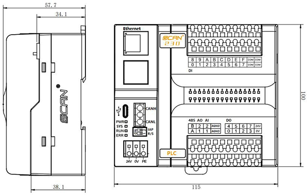 GCAN-PLC-230外觀如圖所示,(長)115mm*(寬)100mm*(高)58mm。