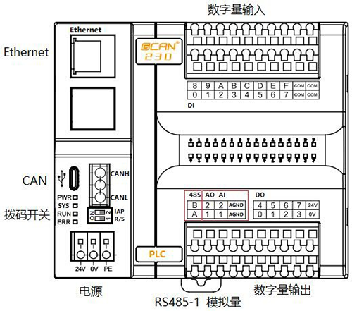 GCAN-PLC-230設備包含1個電源接口,一個USB-Type C接口,1路CAN通信接口,1路RS485通信接口,1路Ethernet通信接口,2路AI接口;2路AO接口;8路DO接口,16路DI接口??刂破骶幊探涌谑褂肊thernet接口,接口定義如下表所示:
