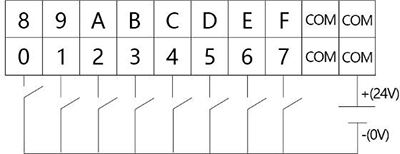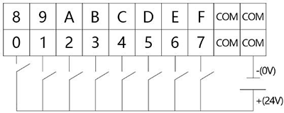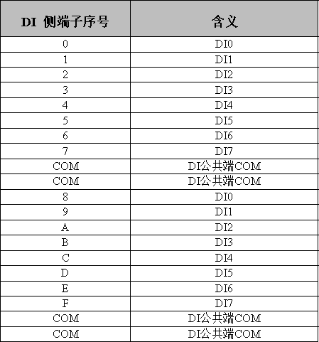 上方兩排端子為DI端子排,分別為DI0~DI7,DI8~DIF共16個數(shù)字量輸入點,以及4個DI的COM接口(4個COM口內部已短接,任意連接1個即可),如圖所示。各個端子對應的序號及其含義如表所示。