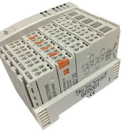 GCAN-PLC系列產品由一個可編程的主控模塊(GCAN-PLC-522等)、若干GC系列IO模塊(GC-1008、GC-3804等)以及一個終端電阻模塊(GC-0001)組成。主控模塊可連接8/16孔版GC系列IO模塊,用戶可根據現(xiàn)場實際需求自行選擇擴展IO模塊,在電源供應充足情況下,IO模塊數(shù)量最多可擴展32個,其中當擴展模塊數(shù)量超過16片時,需額外增加一片IO供電擴展模塊GC 8012以保證電源供應充足,主控模塊可根據插入IO模塊的前后位置自動分配地址,實現(xiàn)自動組態(tài),用戶無需在PC上創(chuàng)建組態(tài)界面及設置參數(shù)。