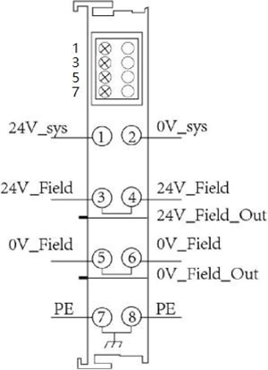 PLC主控模塊的電源接線端子排如圖2.8所示。PLC主控模塊包含8個端子,各個端子對應的序號及其含義如表2.2所示。請注意,3號端子與4號端子之間、5號端子與6號端子之間、7號端子與8號端子之間,在模塊的內部是相連的。