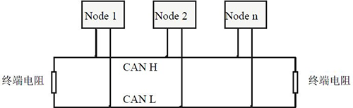 CAN-bus網絡采用直線拓撲結構,總線最遠的2個終端需要安裝120Ω的終端電阻;如果節(jié)點數(shù)目大于2,中間節(jié)點不需要安裝120Ω的終端電阻。對于分支連接,其長度不應超過3米。CAN-bus總線的連接如圖3.1所示。