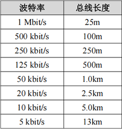請注意:CAN-bus電纜可以使用普通雙絞線、屏蔽雙絞線。理論最大通信距離主要取決于總線波特率,最大總線長度和波特率關系詳見表3.1。若通訊距離超過1km,應保證線的截面積大于Φ1.0mm2,具體規(guī)格應根據距離而定,常規(guī)是隨距離的加長而適當加大。