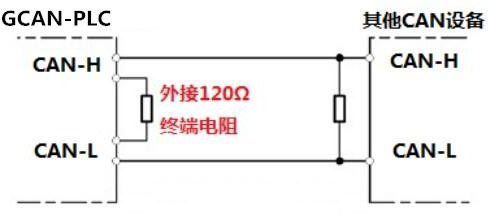 請注意:GCAN-PLC的CAN總線內部未集成120Ω終端電阻。如果節(jié)點數(shù)目大于2,中間節(jié)點不需要安裝120Ω的終端電阻。需要使用時,將電阻兩端分別接入CAN_H、CAN_L即可,如圖3.2所示。