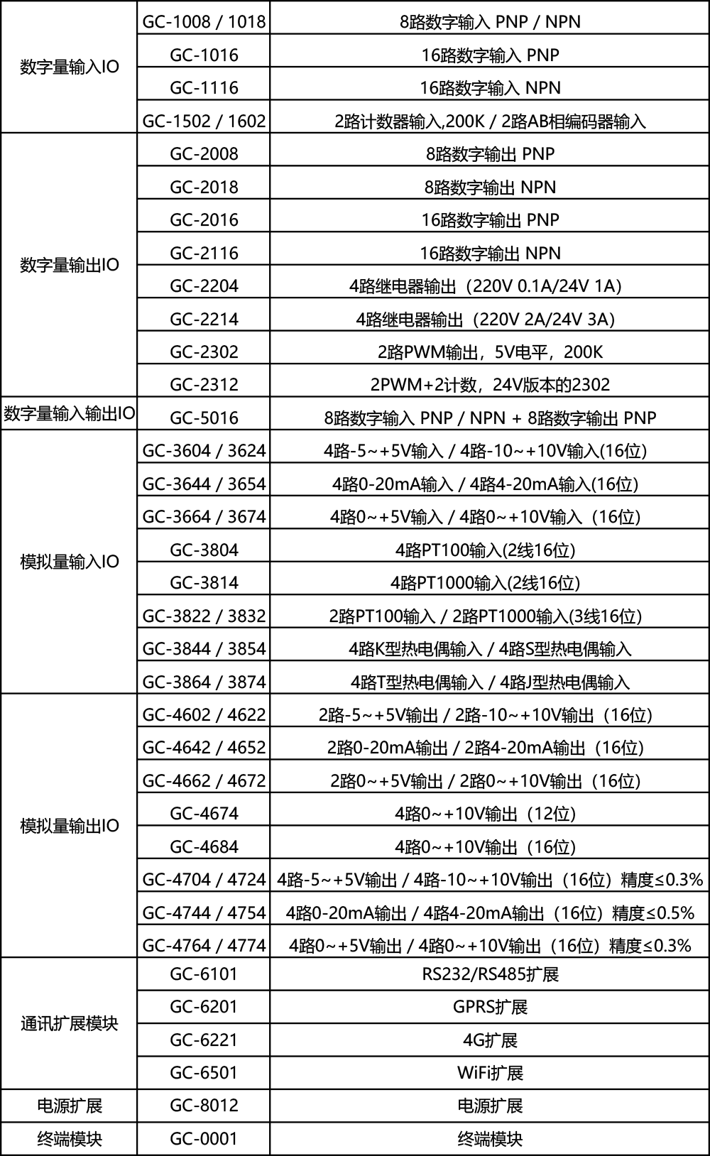 GC系列IO模塊覆蓋全面,包括:開關量輸入及輸出模塊、模擬量輸入及輸出模塊、脈沖輸入及輸出模塊、通訊口擴展模塊(RS232/485、4G、WiFi、GPRS等)。