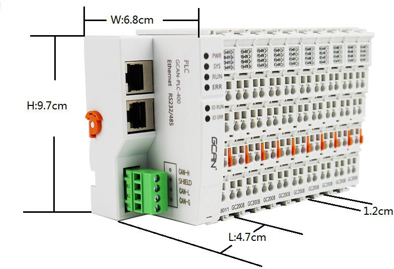 GCAN-PLC-400系列產(chǎn)品由一個可編程的主控模塊、若干GC系列IO模塊以及一個終端電阻模塊(GC-0001)組成。GCAN-PLC-400等主控模塊可連接所有的GC系列IO模塊,用戶可根據(jù)現(xiàn)場實際需求自行選擇擴展IO模塊,在電源供應(yīng)充足情況下,IO模塊數(shù)量最多可擴展32個,其中當(dāng)擴展模塊數(shù)量超過16片時,需額外增加一片IO供電擴展模塊GC 8012以保證電源供應(yīng)充足,主控模塊可根據(jù)插入IO模塊的前后位置自動分配地址,實現(xiàn)自動組態(tài),用戶無需在PC上創(chuàng)建組態(tài)界面及設(shè)置參數(shù)。