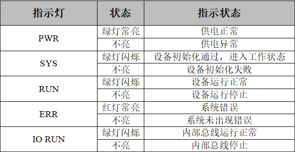 GCAN-PLC-400的正面突出區(qū)域包含6個圓形狀態(tài)指示燈。指示燈的具體指示功能見下表。指示燈處于不同狀態(tài)下時,GCAN-PLC-400的狀態(tài)如下表所示。