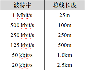 請注意:CAN-bus電纜可以使用普通雙絞線、屏蔽雙絞線。理論最大通信距離主要取決于總線波特率,最大總線長度和波特率關(guān)系詳見下表。若通訊距離超過1km,應(yīng)保證線的截面積大于Φ1.0mm2,具體規(guī)格應(yīng)根據(jù)距離而定,常規(guī)是隨距離的加長而適當(dāng)加大。