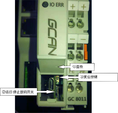 GCAN-PLC-400提供1個程序運行開關(guān)和1個復(fù)位按鍵。打開蓋板后實物圖如下圖所示:
