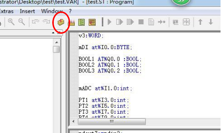 完成變量定義后便可在下方的編程界面開始編程了,下面為用ST編寫的簡單例程語句:
