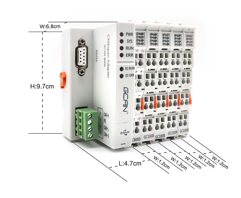 GCAN-IO模塊由一個(gè)總線(xiàn)通信適配器、若干I/O模塊以及一個(gè)終端端子模塊組成。該模塊使用獨(dú)特的可擴(kuò)展結(jié)構(gòu),可連接32個(gè)I/O模塊,用戶(hù)可以根據(jù)自己的需求自行組合出符合現(xiàn)場(chǎng)需求的I/O采集、控制系統(tǒng)。