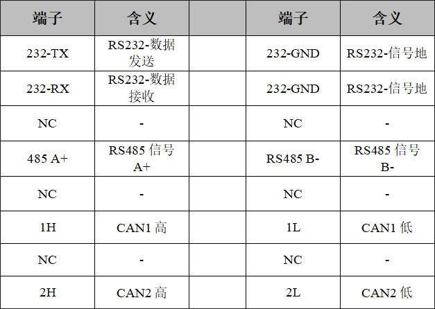 端子接口包括1個RS232、1個RS485,2個CAN總線接口,使用插拔式雙排彈簧按壓式端子引出。