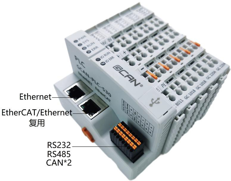 GCAN-PLC-530不僅可完成各種數(shù)字/模擬量的輸入/輸出,還集成了多種常用的工業(yè)現(xiàn)場總線,如:RS232/485總線、CAN總線、以太網(wǎng)總線、EtherCAT總線。