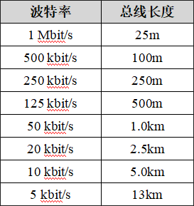 請注意:CAN-bus電纜可以使用普通雙絞線、屏蔽雙絞線。理論最大通信距離主要取決于總線波特率,最大總線長度和波特率關(guān)系詳見表3.1。若通訊距離超過1km,應(yīng)保證線的截面積大于Φ1.0mm2,具體規(guī)格應(yīng)根據(jù)距離而定,常規(guī)是隨距離的加長而適當(dāng)加大。